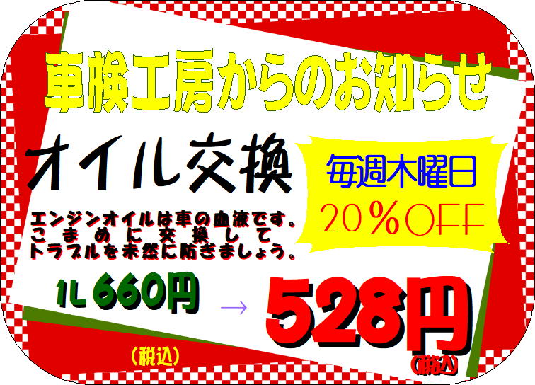 木曜日はオイル交換がお得 通常660円/ℓ(税込)→528円/ℓ(税込) ※車種によって交換数量は異なります