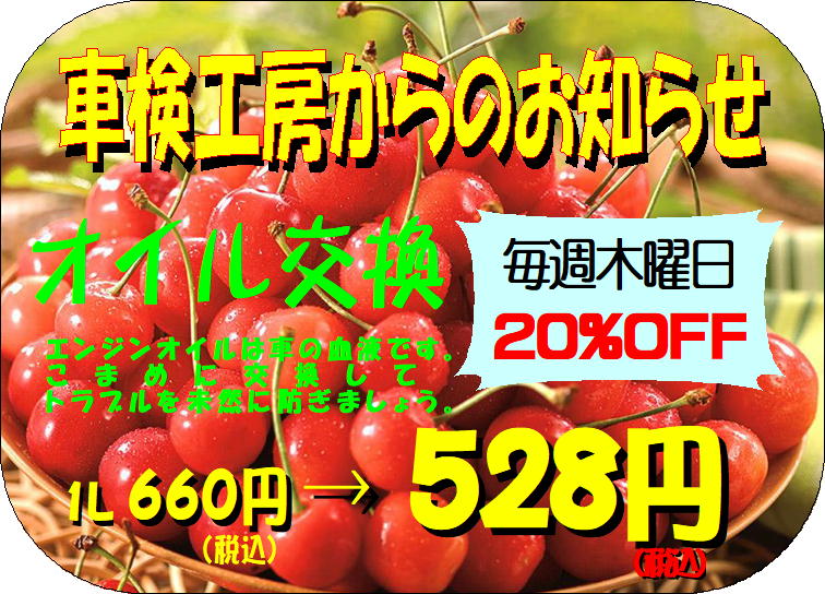 木曜日はオイル交換がお得 通常660円/ℓ(税込)→528円/ℓ(税込) ※車種によって交換数量は異なります